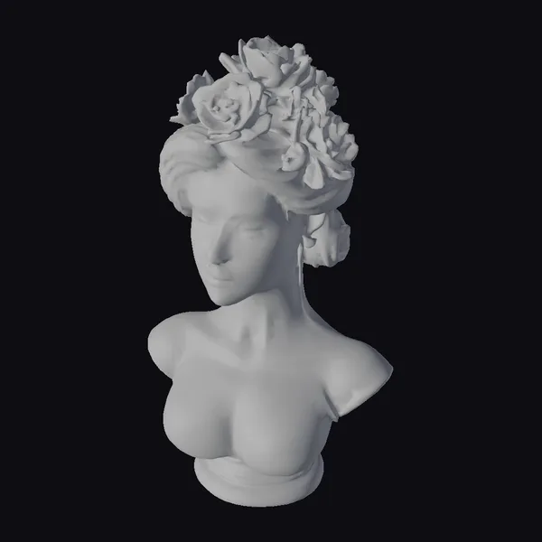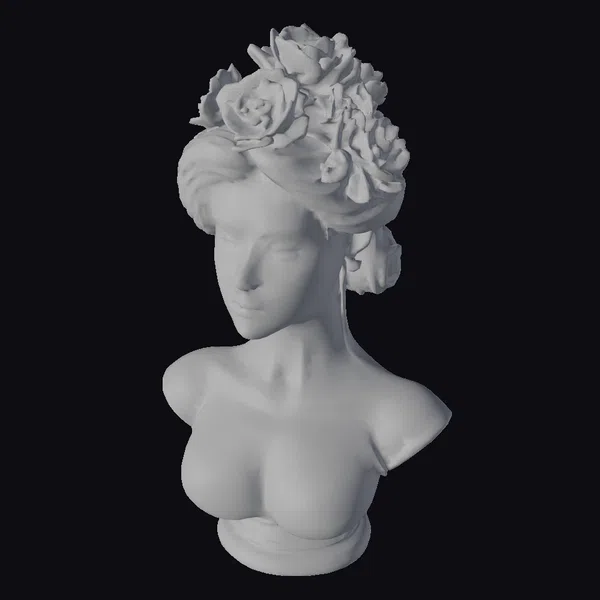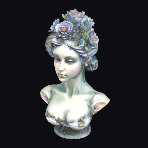 This captivating ceramic bust presents a highly detailed portrait of a woman, her face and shoulders meticulously crafted to showcase a serene expression. Her hair is styled in an updo, beautifully complemented by a lush floral arrangement that adds a pop of color and vibrancy to the piece. The ceramic material is skillfully finished in soft, pastel shades that highlight the intricate textures of her skin, the delicate petals of the flowers, and the subtle nuances of her facial features. The bust’s design emphasizes elegance and grace, making it a versatile asset for various creative projects, including games, animation, virtual reality, and architectural visualization. Its detailed and stylized appearance allows for a wide range of applications, from decorative art to character design.