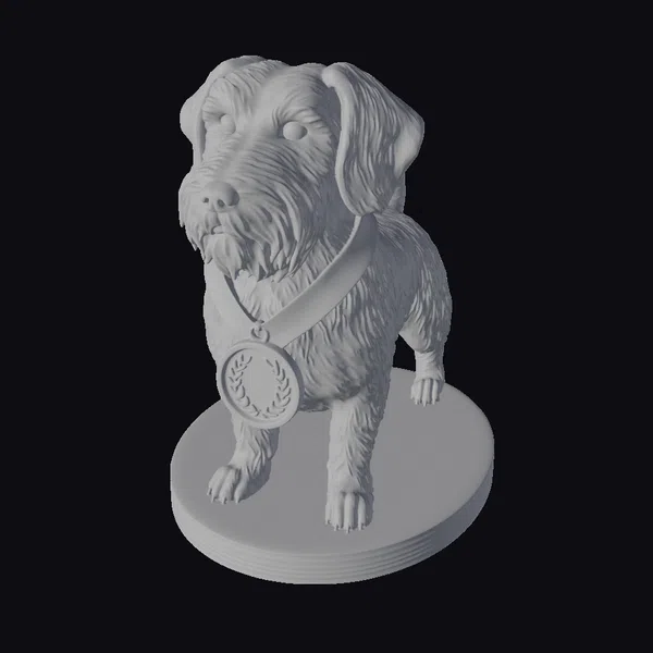 The dog’s body is posed in a dynamic stance, with its weight shifted slightly to one side, giving the impression of readiness to move. The black fur is meticulously detailed, with lighter tan accents around the face, paws, and chest, adding a touch of warmth to the overall appearance. The gold medal, suspended from a black collar, draws attention with its embossed laurel pattern. The base, with its subtle ridges, provides a sturdy foundation for the model. This 3D model is perfect for use in games, animations, or as a decorative piece, offering a blend of realism and charm.
