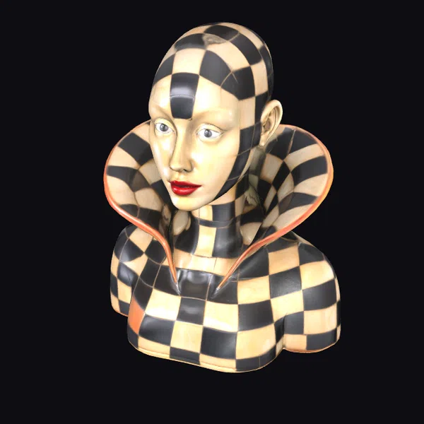 The Checkered Harlequin Bust presents a visually arresting portrayal of a harlequin’s upper body, meticulously crafted with attention to detail. The figure’s face is framed by a sleek, bald head, complemented by a wide, ruffled collar that adds a touch of drama. The black and yellow checkered pattern, reminiscent of traditional harlequin costumes, covers the entire bust, creating a cohesive and eye-catching design. The model’s facial features are stylized, with an emphasis on bold, expressive makeup, including striking red lips and detailed eye makeup. The overall effect is one of playful sophistication, suitable for a variety of applications, from artistic projects and theatrical designs to interior decoration and character modeling in games or animation.