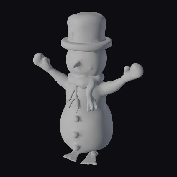 Standing with arms outstretched in a welcoming gesture, this cheerful snowman boasts a robust, rounded body crafted from what appears to be textured snow, complete with three inviting orange and gray buttons down its front. Its carrot nose and rosy cheeks add a touch of whimsy, while its small, coal eyes sparkle with friendliness. Perched atop its rounded head is a sophisticated black top hat, embellished with a bright blue ribbon that matches the snowman’s scarf and gloves, creating a harmonious and festive look. The snowman’s boots are rendered in a simple, gray stone-like material, grounding the figure. This model is perfect for adding a dash of winter wonder to games, animations, or any creative project, offering a blend of playfulness and detailed design.
