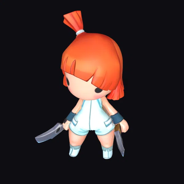 Detailed visual breakdown reveals a chibi-style cartoon girl with a vibrant orange ponytail and expressive black eyes. She wears a sleek white jumpsuit with blue accents, complete with matching wristbands and knee-high socks. Her outfit is a perfect blend of style and functionality for an adventurous spirit. The model showcases exceptional detail, from the texture of her hair to the design of her dual swords. Ideal for use in games, animations, or 3D printing projects, this model brings a burst of energy and personality to any scene.