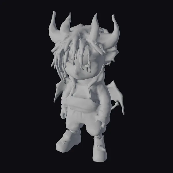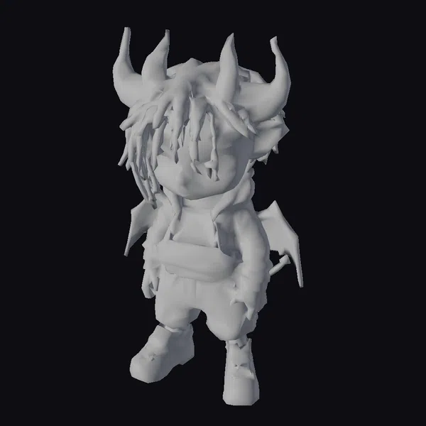 This stylized 3D model of a chibi demon boy boasts intricate details, from his sharp horns and dark brown dreadlocks to his glowing red eyes and bat-like wings. His rounded yet imposing physique is balanced by a casual grey outfit, complete with a hoodie, shorts, and chunky boots. The model’s textures and lighting create a captivating visual effect, making it perfect for use in games, animations, or 3D printing. Its unique blend of cute and edgy features will add a touch of fantasy to any project.
