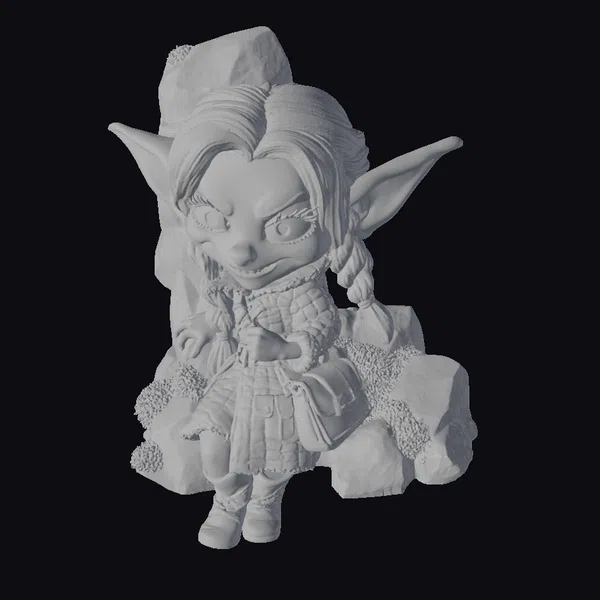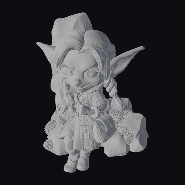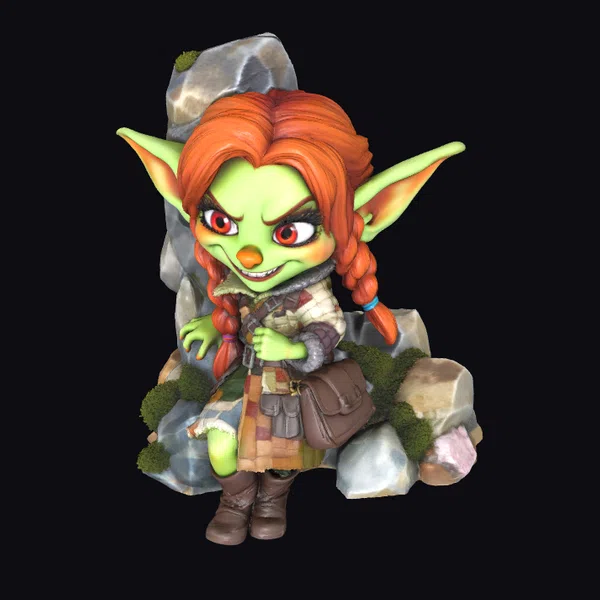 Perched atop a mossy rocky outcropping, this chibi female goblin strikes a pose that is equal parts fierce and playful. Her light green skin has a warm, almost tawny glow, complemented by large, expressive red eyes that seem to sparkle with mischief. Two braids of coppery red hair cascade down her back, adorned with small blue bands at the ends. She wears a patchwork outfit consisting of a plaid skirt and a fur-trimmed jacket, along with a sturdy pair of brown boots. A leather bag hangs at her side, suggesting she’s always prepared for her next escapade. The intricate details, from the texture of her skin to the stitching on her clothing, make this model a standout. Ideal for use in games, animations, or as a unique decorative piece, this chibi goblin brings a touch of whimsy and fantasy to any project.
