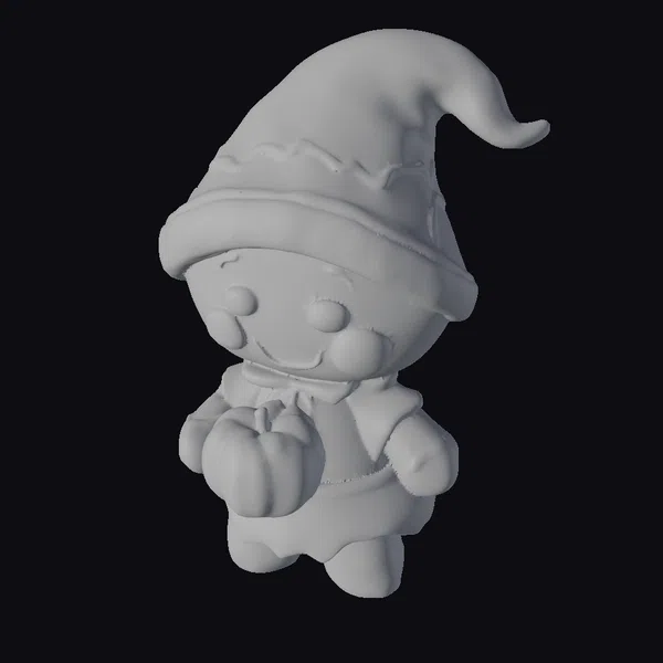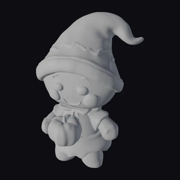 In a charming chibi style, this gingerbread man stands out with his bright orange hat, complete with wavy white icing details that add a touch of whimsy. His round, rosy cheeks and curved smile evoke a sense of joy, while his black shirt and green skirt provide a stylish contrast to his gingerbread body. Holding a glossy black pumpkin, this character embodies the spirit of Halloween with a dash of playfulness. The white icing accents on his arms and legs add a delightful finishing touch. Perfect for projects that require a festive and fantastical element, this model is suited for use in games, 3D printing, VR/AR experiences, animations, and designs that call for a sweet and lively character.