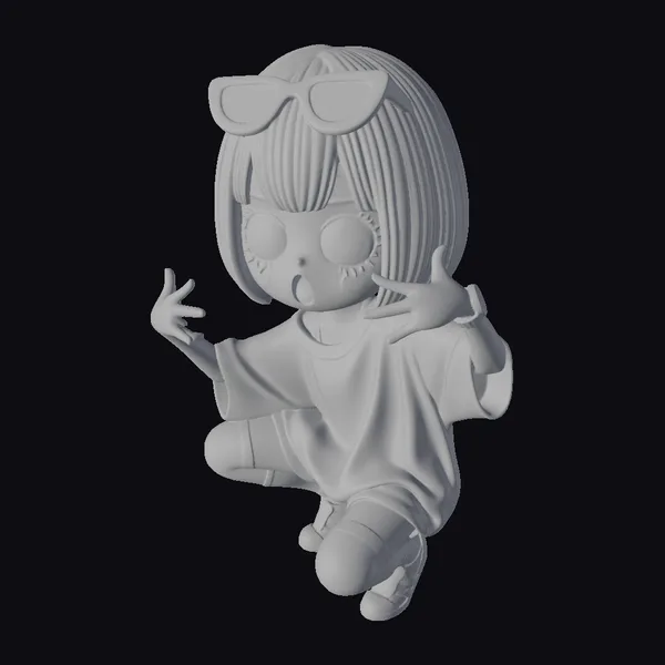 Detailed with precision, this chibi girl model showcases a vibrant personality. Her black hair is styled in a chic bob, complemented by oversized yellow sunglasses perched on her forehead. She wears a loose-fitting beige top with black accents, paired with yellow leggings and white sneakers. Her facial expression is one of joyful surprise, with wide eyes and an open mouth. Her arms are posed in a dynamic, playful gesture. This model excels in various applications, including game development, animation projects, virtual reality experiences, and 3D printing. Its high-quality design ensures it will be a standout in any scene.