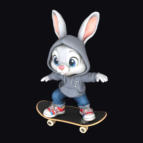 Detailed in every aspect, this chibi-style rabbit stands out with its dynamic pose on the skateboard, arms outstretched for balance. The character’s white fur is complemented by pink inner ears and a nose, while its blue eyes sparkle with mischief. The gray hoodie with a small tag, blue jeans, and red sneakers with white laces and multicolor accents, contribute to its casual and cool demeanor. The skateboard, with its black top and tan edges, features white wheels that seem ready to roll. This model is perfect for animations, games, or any creative project requiring a fun, youthful character. Its high-quality details make it suitable for close-up shots or scenes requiring character interaction.