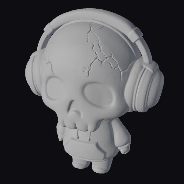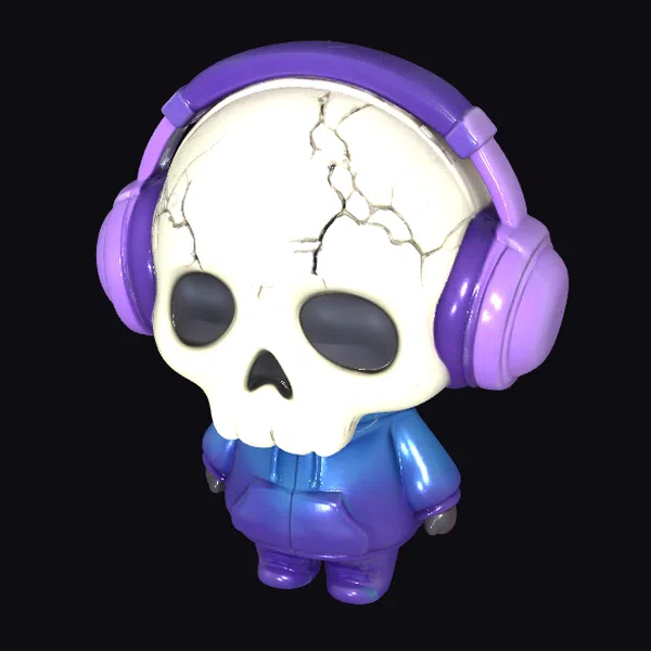 Detailed in every aspect, this chibi character model showcases a cracked skull with a smooth ivory albedo gradient, complemented by shiny purple headphones and a blue outfit with a gradient effect. The pose is dynamic, with the character’s arms slightly bent, inviting a sense of movement. The large, dark eyes and small black nose on the skull add a quirky charm. Textures are finely detailed, with visible cracks on the skull and a reflective sheen on the headphones and outfit. This model is perfect for projects requiring a unique character design, suitable for games, 3D printing, VR/AR experiences, animation, and design projects.