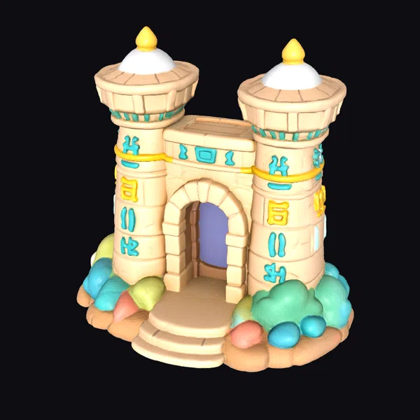Step into a whimsical world with this adorable, stylized 3D render of a chibi Temple Gate Pylon, boasting a rounded, inviting clay aesthetic and rich, vibrant colors. The gate’s design is playful and fantastical, complete with two towers, colorful hieroglyphics, and a pathway leading to a purple doorway.