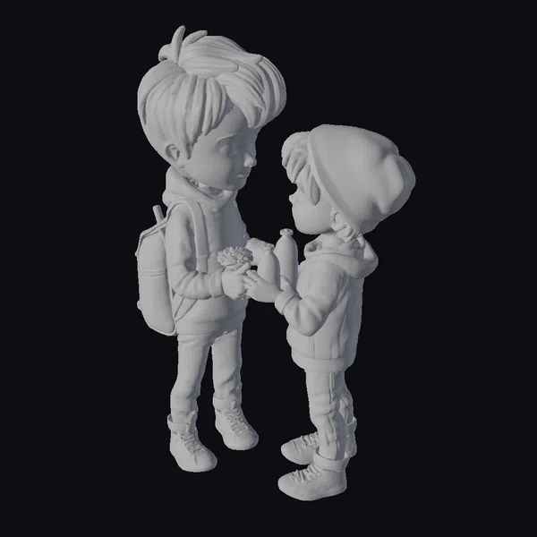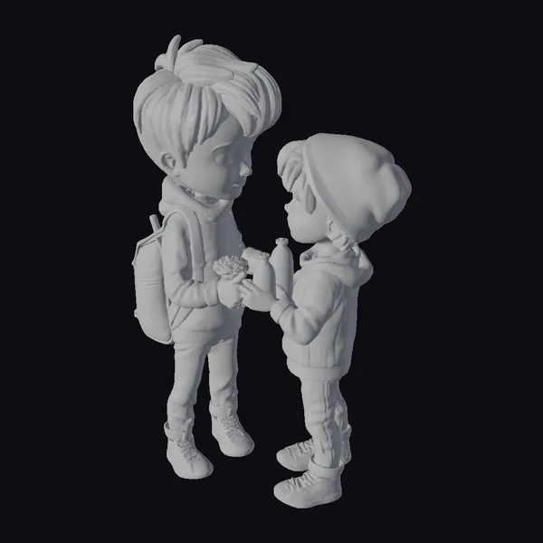 Detailed in a cartoon style, this 3D model captures a poignant moment between two children. The boy on the left, with a backpack, offers a bottle of water and some snacks to his friend. The model showcases their facial expressions and body language, emphasizing their interaction. The textures, from the casual clothing to the backpack, are finely detailed. This model is perfect for projects focusing on themes of charity, friendship, and social responsibility, suitable for animations, games, or VR/AR experiences.