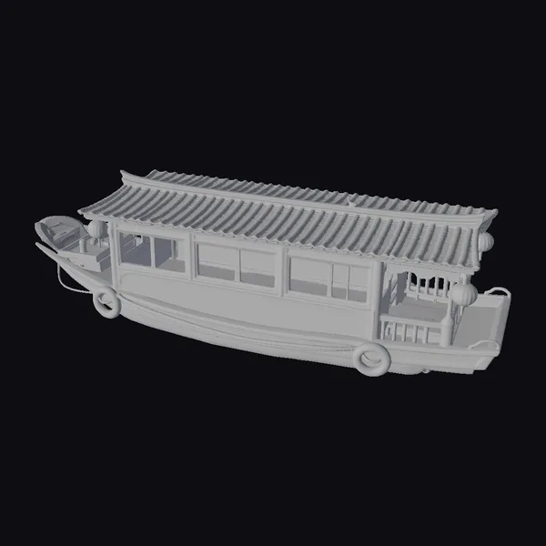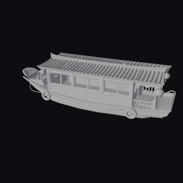 Positioned in a gentle curve, the houseboat’s black roof with curved tiles stands out against the crisp white background. The side of the boat features large windows framed in red, offering a glimpse into the cozy interior. A white band encircles the boat, adorned with green and red designs, adding to its aesthetic appeal. Two red lanterns hang from the roof’s edges, while a small deck at the front and back invites relaxation. This model is perfect for use in games, 3D printing, VR/AR experiences, animation, and design projects, offering a unique blend of traditional and modern elements.