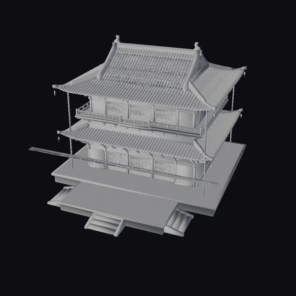 In a stunning display of traditional Chinese architecture, this intricately designed temple boasts a golden roof that appears to shimmer in the light. The roof’s curved lines and ornate eaves are meticulously crafted, while red pillars and lattice windows add a pop of color and texture. The temple’s base, a sleek gray platform, provides a subtle contrast to the rich, warm tones of the structure. A small staircase leads up to the temple, inviting exploration. This 3D model is perfect for use in games, architectural visualizations, or animations, offering a unique blend of cultural heritage and visual appeal.