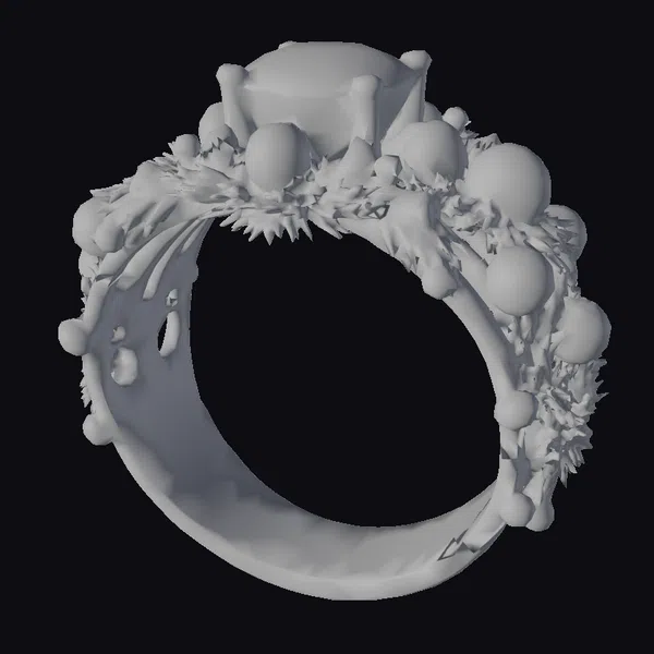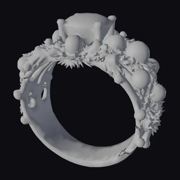 Crafted with meticulous detail, this Christmas ring boasts a sturdy gold band embellished with lush green pine branches, interspersed with red berries and white ornaments that give it a whimsical touch. At its centerpiece, a large, oval-cut red gemstone shines brightly, secured by four golden prongs. The combination of textures, from the smooth gold and gemstone to the intricate foliage and bumpy berries, invites the eye to explore every nook. This model is perfect for those looking to add a touch of holiday spirit to their 3D projects, whether for animation, game design, virtual reality experiences, or even 3D printing.