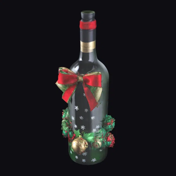 Standing tall with its black cap and gold foil neck, this exquisitely detailed Christmas wine bottle model is a festive masterpiece. The bottle’s dark glass body is adorned with a beautiful, intricately designed red and gold ribbon tied in a bow, surrounded by vibrant green garland clusters complete with red berries and gold ornaments. Delicate white snowflakes are scattered across the bottle, adding a whimsical touch. The model’s attention to detail makes it perfect for use in 3D animations, games, or architectural visualizations where a touch of holiday magic is needed. Its high level of detail and realistic textures make it suitable for professional projects requiring a premium look.