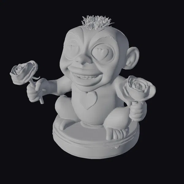 Detailed with precision, this stylized cherub figurine sits cross-legged on a round base, its plump body and face radiating joy. The cherub’s eyes are heart-shaped, with white and red details, matching the red hearts on its cheeks and chest. Its eyebrows are neatly groomed, and its lips are painted a vibrant red. Two roses, one in each hand, add a pop of color against the cherub’s cream-colored skin. A small green tuft tops its head, completing the whimsical look. This model is perfect for use in games, 3D printing, VR/AR experiences, animation, and design projects, offering a versatile and eye-catching element.
