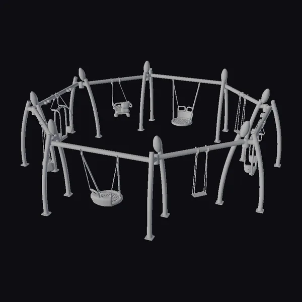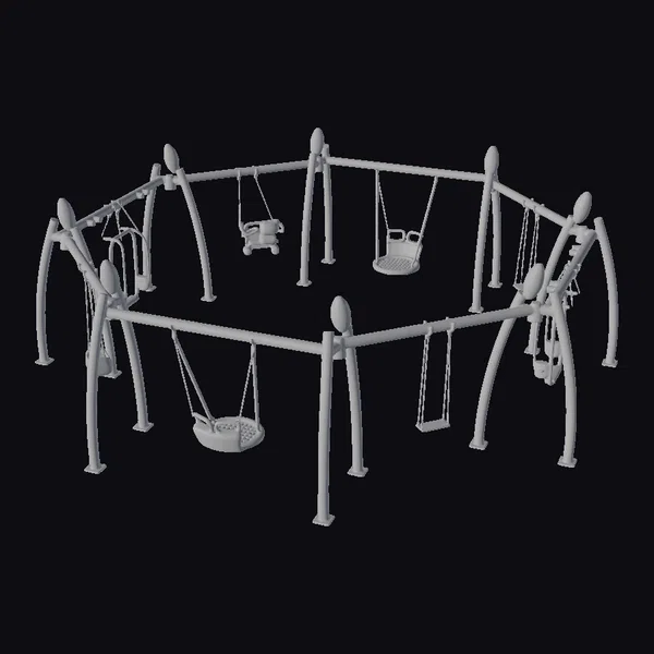 Imagine a playground centerpiece that combines fun, safety, and creativity – this circular swing set is precisely that. The set boasts a sturdy dark gray metal frame with multiple swings suspended from it, including a green seat, a blue disc swing, a purple animal-shaped swing, and a baby swing. Each swing is meticulously detailed, showcasing different textures and colors. The frame’s design ensures stability while the yellow accents on top of the curved supports add a safety-focused aesthetic touch. The arrangement of swings on two levels maximizes space and encourages interactive play. This model is perfect for 3D environments aimed at capturing the essence of outdoor recreational spaces, making it ideal for projects focused on playgrounds, parks, or residential areas in games, animations, or architectural visualizations.