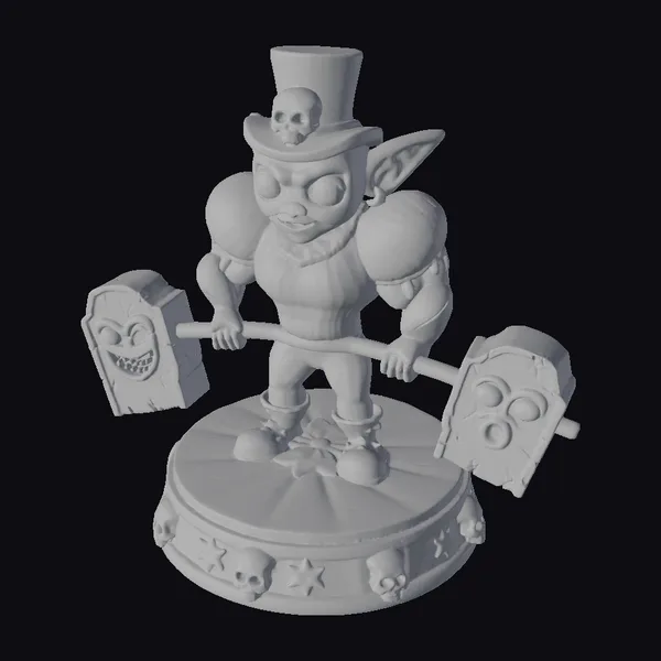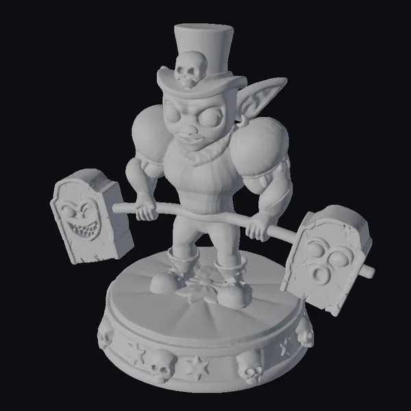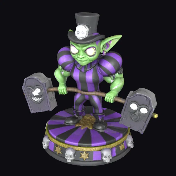 In a mesmerizing display of strength and whimsy, a green-skinned goblin stands proudly on a circular platform, its purple and black striped costume a stark contrast to the eerie atmosphere. The goblin’s eyes glow with an otherworldly light as it lifts a barbell adorned with two tombstone-shaped weights, each featuring a skull. The platform itself is a marvel of detailed design, complete with a gold-trimmed border, stars, and a scattering of skulls around its base. The goblin’s top hat, complete with a smaller skull perched atop, adds a touch of dark humor to the overall aesthetic. This 3D model is perfect for adding a touch of macabre whimsy to games, animations, or 3D printed collectibles.