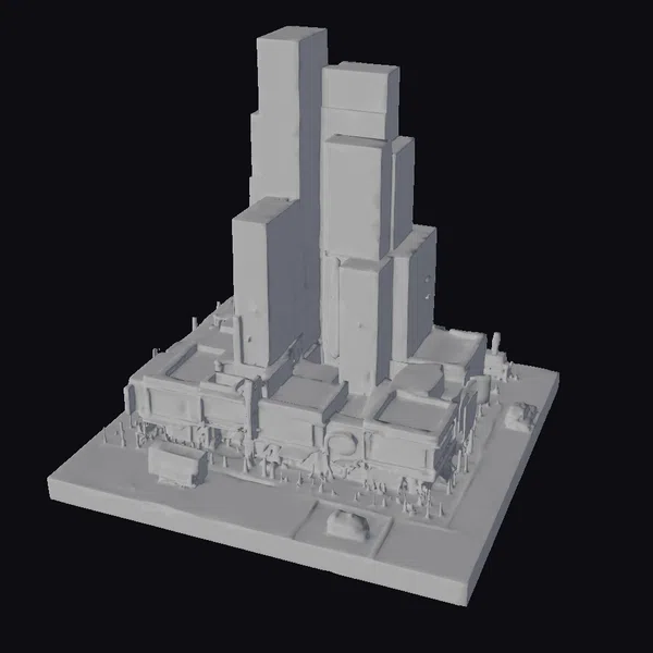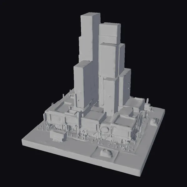 Perched on a sturdy base, this meticulously crafted diorama presents a stunning urban landscape. The centerpiece is a cluster of towering skyscrapers, their gray facades glistening with a subtle sheen. The buildings’ varied heights and angles create a sense of depth and realism. At street level, a tapestry of activity unfolds: people mill about, cars and a trolley bus navigate the roads, while storefronts and billboards add a pop of color to the scene. The nighttime atmosphere is palpable, with warm lighting casting a golden glow on the pavement and surrounding structures. This diorama is perfect for use in architectural visualizations, film and video game environments, or as a decorative piece. Its detailed design and engaging scene make it an excellent choice for anyone looking to add a touch of urban excitement to their project.