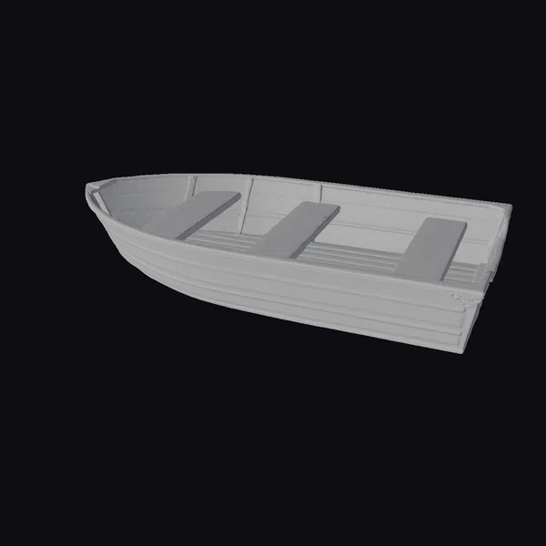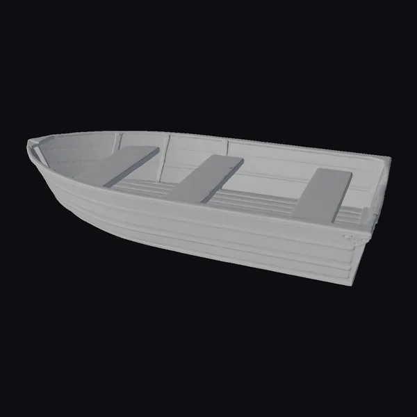 Positioned at a gentle angle, the rowboat’s sleek white hull glistens with a subtle sheen, as if kissed by the sun. Three dark gray seats are evenly spaced within, their simple design a testament to the boat’s understated elegance. A small black logo on the side reads ‘duraBoat’ in crisp white letters. The boat’s wooden texture is finely detailed, with horizontal slats adding depth to its appearance. As a 3D model, it’s perfect for designers and artists looking to add a touch of realism to their projects, whether for animation, games, or architectural visualizations. Its classic design ensures it will complement a variety of environments, from serene lakeside scenes to bustling harbor settings.