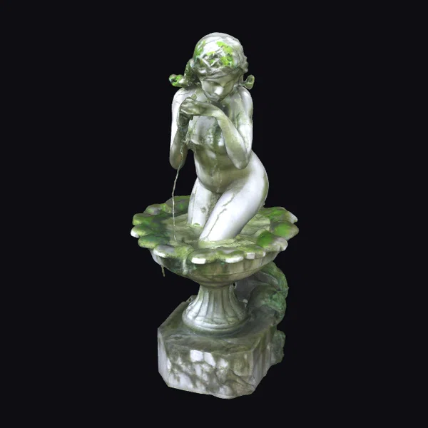 The statue depicts a Nereid in a dynamic, asymmetrical pose, kneeling on one knee as she holds a conch shell to her lips. Water streams from the shell, cascading into the bowl-shaped base adorned with leaf-like protrusions. The entire structure, crafted from stone, showcases exceptional detail, from the flowing locks of the Nereid’s hair to the delicate folds of her garment. A thick layer of moss and dirt covers parts of the statue, suggesting age and neglect. The cracked and weathered appearance enhances the realism of the piece. Ideal for use in architectural visualizations, game environments, or historical reconstructions, this model brings a touch of classical elegance to any scene. Its high level of detail makes it suitable for close-up shots or as a focal point in larger compositions.