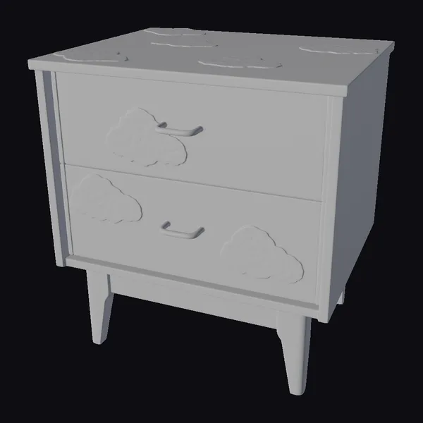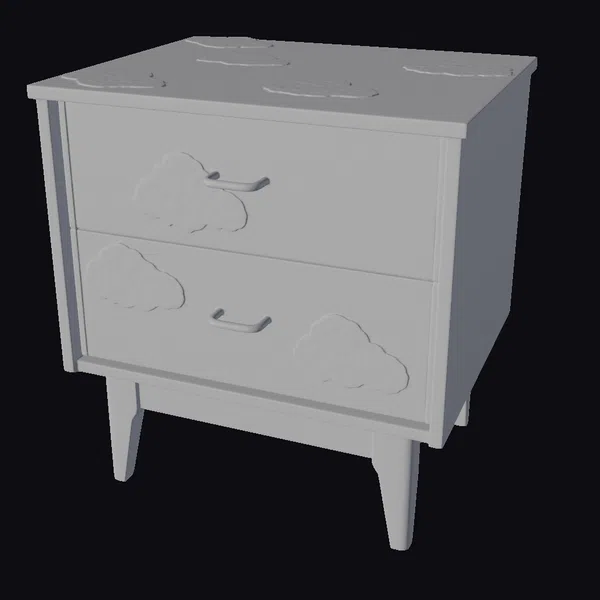 Detailed with precision, this stylized nightstand model showcases a delightful sky-inspired design. The two drawers are embellished with puffy white clouds outlined in yellow, set against a tranquil blue backdrop. A vibrant yellow sun peeks out from the side, adding a pop of warmth. The top of the nightstand is scattered with additional cloud motifs, completing the whimsical theme. Crafted with attention to detail, this model is ideal for use in 3D rendering projects, animation, game development, or as a decorative element in architectural visualizations. Its unique design makes it a standout piece for any children’s room or fantasy setting.