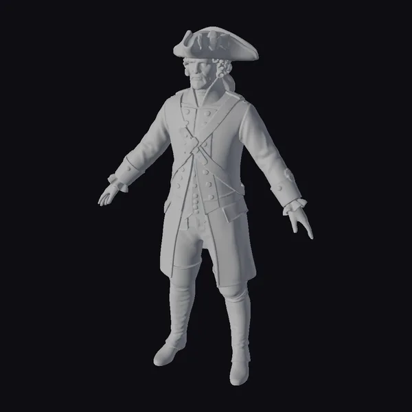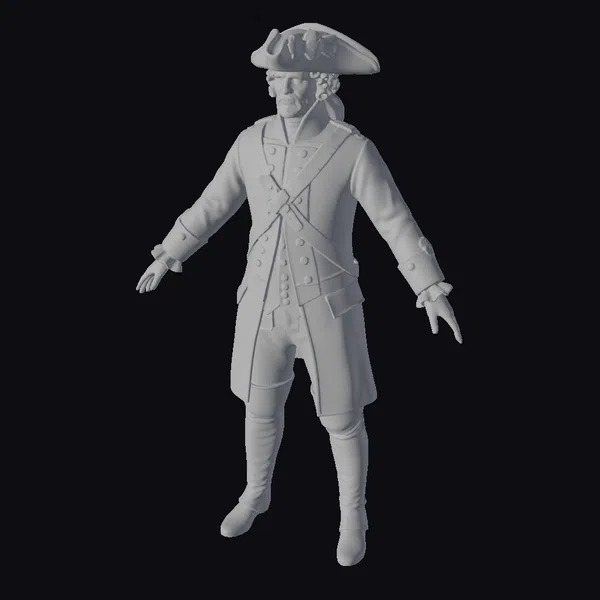 Standing tall with arms outstretched, this 3D model of a colonial military officer exudes authority and historical charm. The navy blue coat with red cuffs and collar, adorned with gold buttons and white sash, is a masterpiece of historical accuracy. The model’s gray wig, tied back under a black tricorn hat with white trim, adds to the authenticity. The uniform’s texture, the sheen on the boots, and the delicate folds of the fabric are all rendered with precision. This model is perfect for projects requiring a historically accurate colonial soldier, whether for educational purposes, historical reenactments, or immersive experiences in games and animations.