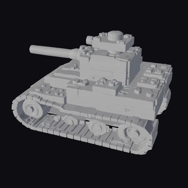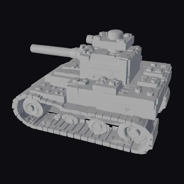 Snap into focus a meticulously crafted, multi-colored brick tank that seems to leap out of a child’s playroom. The model features a sturdy base constructed from grey bricks, supporting a body and turret built from a medley of red, yellow, green, blue, and orange blocks. The tank’s imposing cannon, painted a vibrant orange, stretches out from the turret, giving the model a sense of dynamic movement. With its chunky grey tracks and wheels, this model embodies a sense of playful ingenuity. Ideal for use in animations, games, or 3D printing projects that require a touch of whimsy and nostalgia.