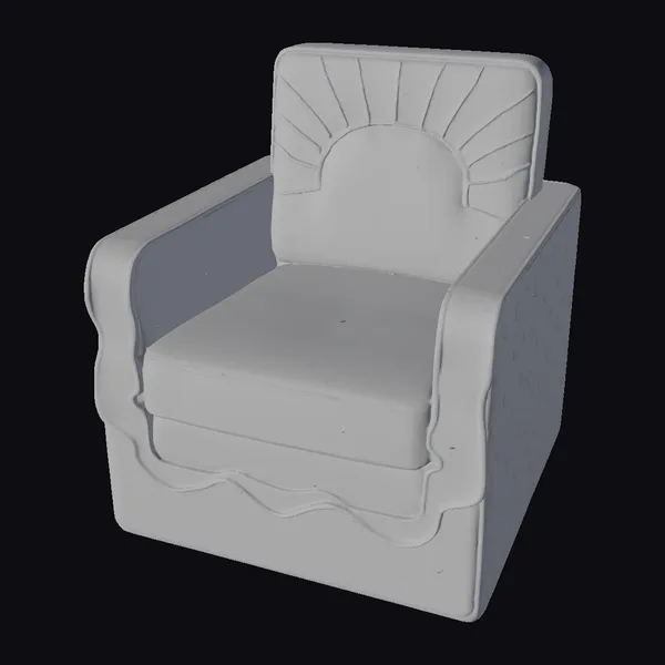Detailed with precision, this pop art armchair boasts a sturdy base adorned with white polka dots on a blue background, providing a lively foundation. The seat and backrest are a bright, cheerful yellow, while the backrest features a striking sunburst design outlined in dark gray. The armrests are trimmed with orange, adding a pop of color and depth. Crafted with meticulous attention to detail, this model excels in various applications, including 3D rendering, animation, and 3D printing. Its unique design makes it perfect for adding a touch of whimsy to any virtual environment or design project.