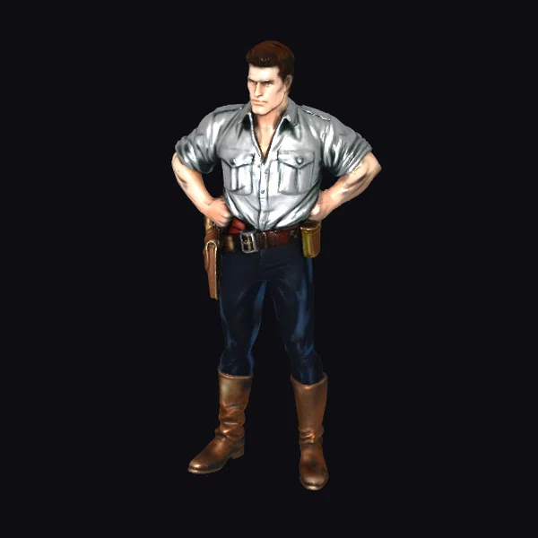Detailed with precision, this character model showcases a man with short brown hair, wearing a gray short-sleeved shirt with two breast pockets, dark blue pants, and tall brown boots. His hands rest on his hips, emphasizing a confident stance. A brown leather belt cinches at his waist, from which a holster and other utility items are attached. His facial expression is stern, adding to his adventurous persona. Ideal for projects requiring a character with an air of confidence and readiness, such as games, animations, or virtual reality experiences.