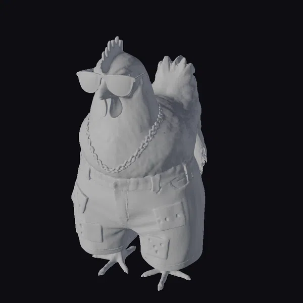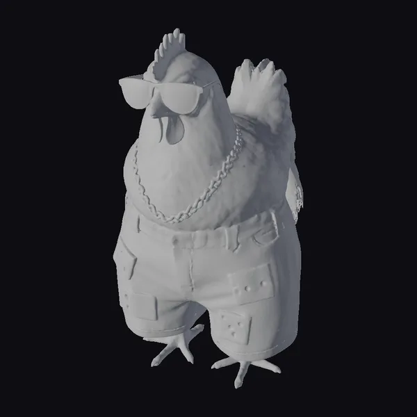 This cartoon chicken model is posed in a confident stance, showcasing its stylish accessories and humorous design. The chicken’s white feathers and red comb are detailed with texture, while its sunglasses and gold chain add a touch of coolness. The blue denim shorts with yellow cheese patches are a quirky twist, suggesting a fun and playful vibe. The model’s proportions are exaggerated for comedic effect, making it ideal for animations, games, or any creative project that needs a lighthearted character. The high-quality model is ready to bring laughter and joy to your audience.