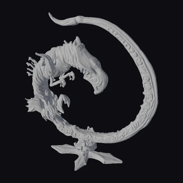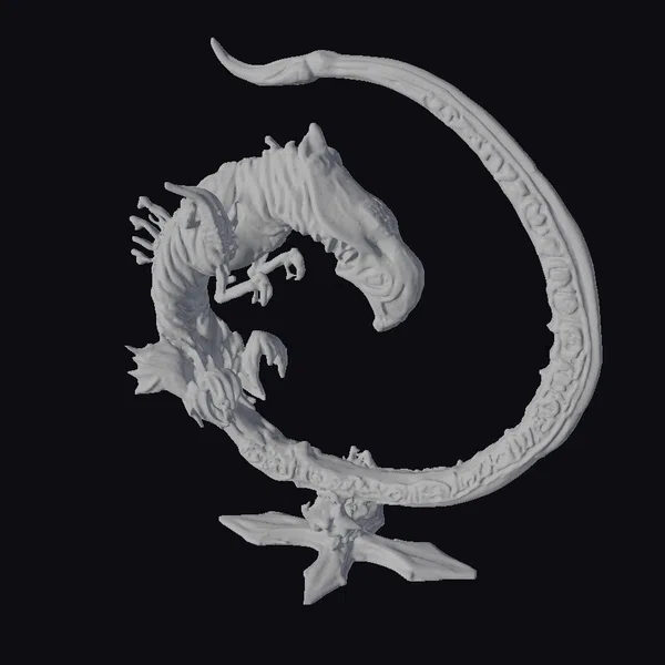 This striking copper Xenophobe coil artifact presents a mesmerizing blend of sci-fi and ancient mysticism. The sculpture’s pose, with the curved, pointed tail extending upwards, creates a dynamic sense of movement. The alien head, with its distinctive, almost-dragon-like features, appears to be emerging from the coil, as if birthed from the very metal itself. The rusty, metallic texture suggests age and wear, adding to the artifact’s mystique. The coil’s base, resembling a stylized star or flower, provides a sense of grounding and stability. This piece would be perfect for adding a touch of sci-fi elegance to any setting, whether in games, print, VR/AR, animation, or design projects.