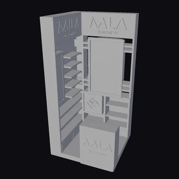 Crafted with meticulous attention to detail, this cosmetic display booth boasts a contemporary design with a black finish and crisp white lettering. The structure features multiple shelves and compartments to neatly organize an assortment of beauty products, including makeup and skincare items. A central display case showcases a vibrant pink and gray pattern, drawing the eye to the featured products. The booth’s clean lines and minimalist aesthetic make it perfect for high-end retail environments. Ideal for use in games, print materials, VR/AR experiences, animation projects, and design visualizations.