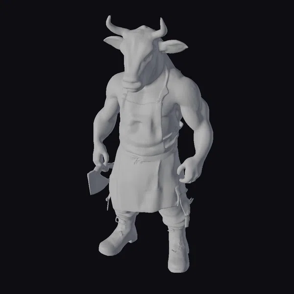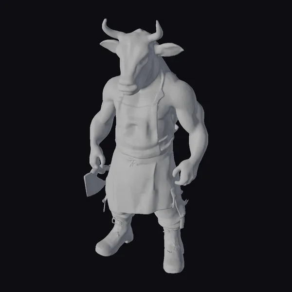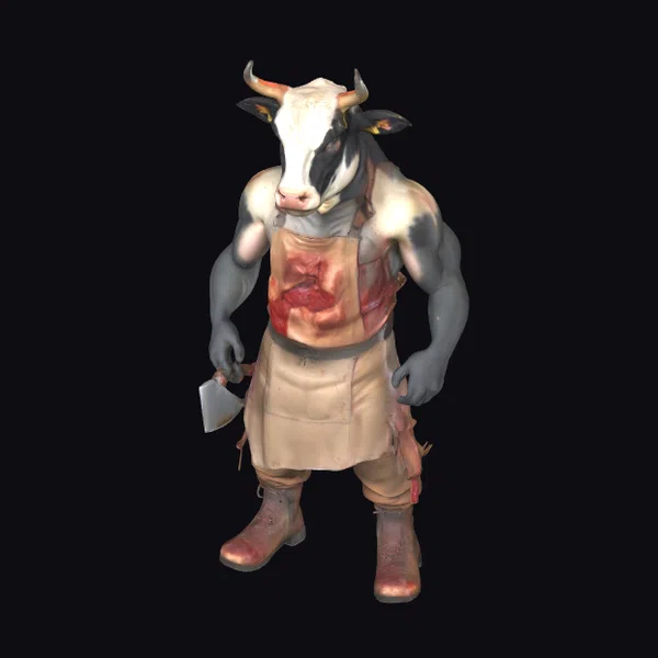 The Cow Butcher Hybrid stands imposingly, its humanoid body merged with the distinctive features of a cow, including its head with horns and ears. The character’s muscular arms and legs are a stark contrast to its bovine visage, creating a fantastical creature that is both intriguing and intimidating. The butcher’s apron, stained with blood and chunks of meat, adds to the dark and ominous mood. A large cleaver in its hand suggests a readiness for butchery. This model is perfect for projects requiring a unique, dark fantasy character, suitable for games, animations, or 3D printing. Its detailed textures and pose offer a rich base for further customization.