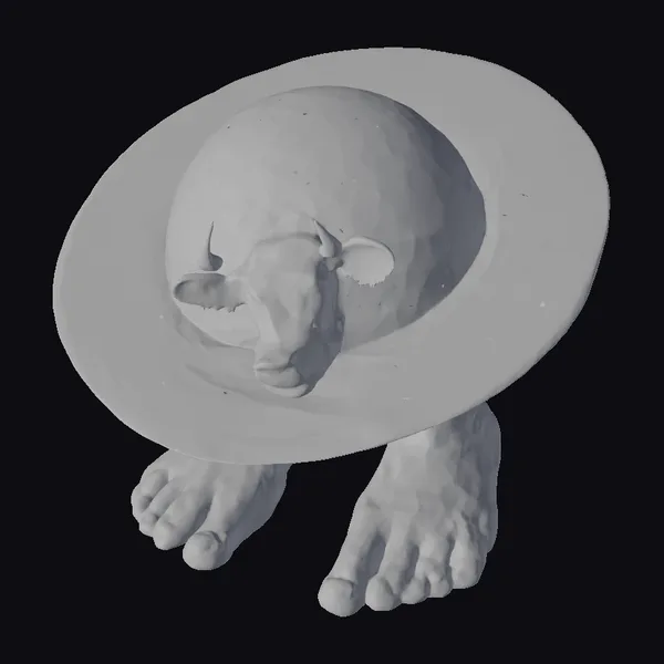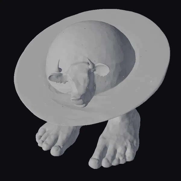 In a detailed visual breakdown, a cow’s head with black and white fur and brown eyes peeks out from a large, light blue and beige globe. The globe rests on a metallic gray, bowl-like structure, which is surprisingly supported by a pair of bare human feet with toenails. The stylized model features a quirky, artistic vibe with a focus on surrealism. The combination of textures, from the smooth globe to the cow’s fur and the metallic base, adds depth. This model is perfect for use in games, 3D printing, VR/AR experiences, animation, and design projects that require a touch of whimsy and fantasy.