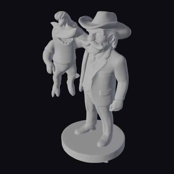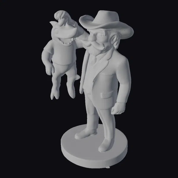 Detailed visual breakdown reveals a cowboy standing on a round beige base, dressed in a gray suit and hat, with a distinctive shark toy held in his right hand. The shark toy boasts a comically exaggerated appearance, complete with a cheerful smile and red eyes. The cowboy’s facial expression is calm, adding to the humor. Textures are smooth, with subtle shading that enhances the 3D effect. This model excels in games, print projects, VR/AR experiences, animation, and design applications where a quirky touch is desired.