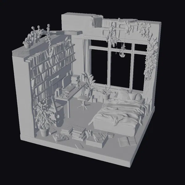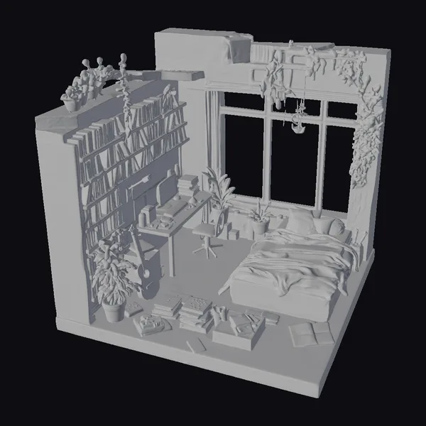In this inviting interior, every detail whispers comfort. The bed, adorned with a dark throw and crisp pillows, sits beneath a window framed by vibrant plants. A guitar rests against the wall, near a desk cluttered with computer and books, suggesting a haven for both rest and productivity. Shelves overflowing with books and scattered papers on the floor add to the room’s lived-in charm. The stylized aesthetic blends realism with a touch of fantasy, making this space feel both familiar and uniquely special. Ideal for projects requiring a cozy, creative atmosphere, such as animations, games, or architectural visualizations.