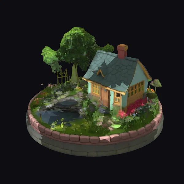 Perched on a circular base, this stylized cottage garden scene presents a picturesque haven. The cottage itself boasts a slate grey roof, complemented by soft blue walls and warm, honey-toned wood accents. A sturdy red brick chimney rises from the roof, emitting a gentle plume of smoke that blends seamlessly into the atmosphere. The surrounding garden is a riot of color, with pink flowers spilling over the edges of the raised bed and a majestic tree standing sentinel to the left. A small wooden gate, partially hidden by the foliage, suggests a pathway leading to secret adventures. The scene is bathed in a soft, diffused light that accentuates the textures of the stone path, the brick wall, and the lush grass. This model is perfect for use in games, animations, or architectural visualizations where a touch of fantasy and tranquility is desired.