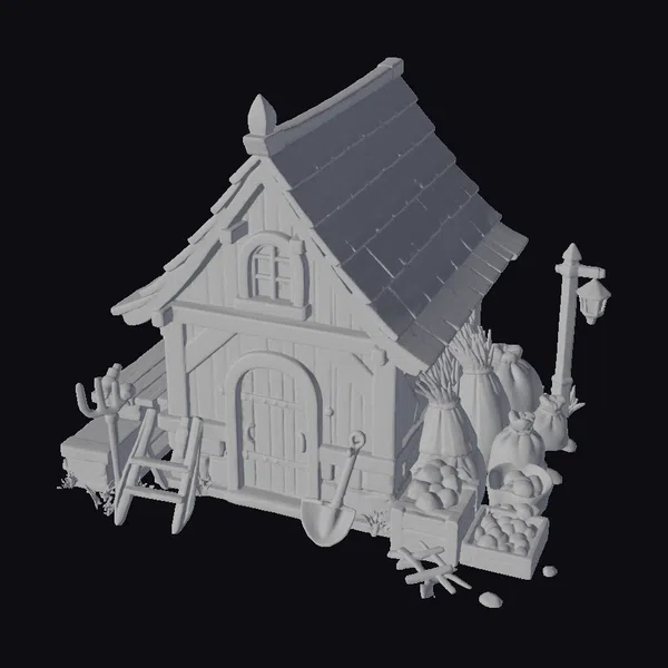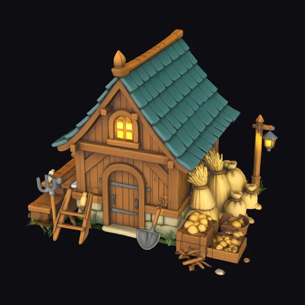 Nestled in a serene setting, this stylized farmhouse boasts a sturdy stone foundation and a warm, honey-brown wooden exterior. The green roof, complete with a delicate finial, adds a touch of whimsy. A lantern post stands tall to the right, casting a warm glow on the surrounding harvest scene. Bundles of golden wheat and baskets overflowing with fresh produce create a sense of abundance. The wooden door, adorned with a metal band, is slightly ajar, inviting you to explore the cozy interior. This charming scene is perfect for games, animation, or architectural design projects seeking a rustic, countryside feel.