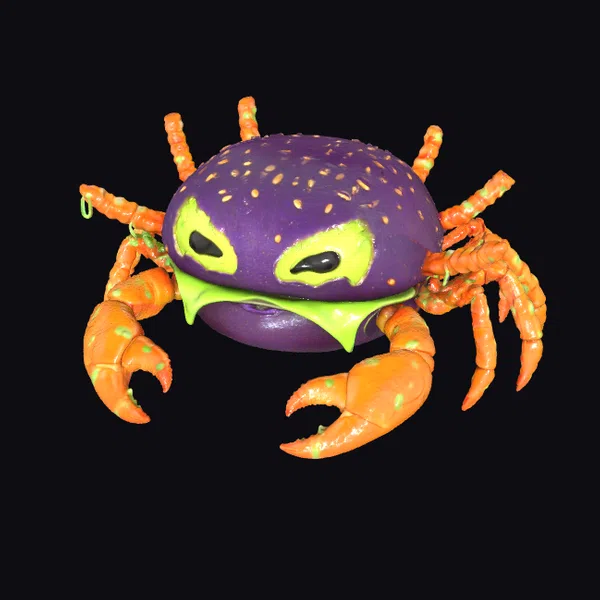 Detailed with precision, this crab burger creature boasts a purple bun ‘body’ speckled with sesame seeds, complemented by bright orange crab legs that appear ready to snap. The green ‘melted cheese’ oozing from the bun adds a deliciously eerie effect. Its black and yellow eyes give it a mischievously evil look, perfect for Halloween-themed projects or whimsical food illustrations. Use it in games, 3D print, VR/AR experiences, animations, or designs that call for a fantastical twist on fast food.