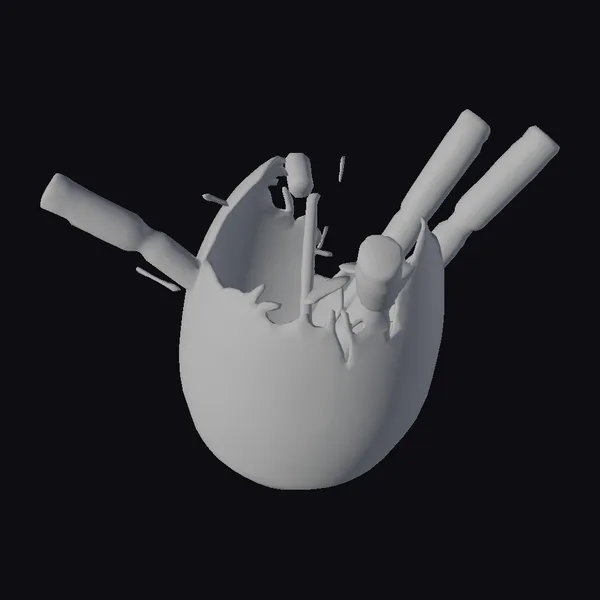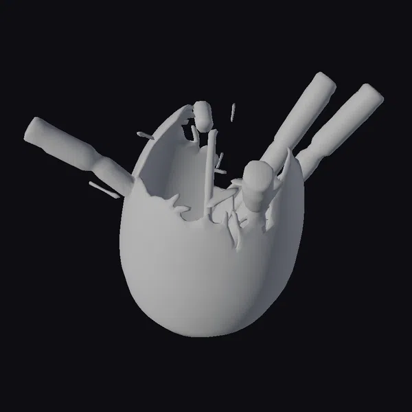 In a burst of creative energy, a stylized egg model shatters to reveal a cluster of baseball bats emerging at dynamic angles, as if propelled from within. The egg’s surface is a light beige hue with pronounced cracks and a soft, warm glow emanating from the interior, suggesting an inner light. The bats, varying in color from deep brown to vibrant orange, are captured in mid-explosion, adding a sense of movement and chaos. This model is perfect for those looking to add a touch of whimsy or fantasy to their projects, whether in games, animation, or as a decorative piece. Its stylized appearance ensures it stands out, offering a blend of humor and visual interest.