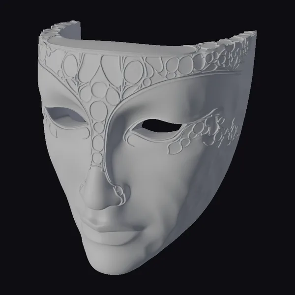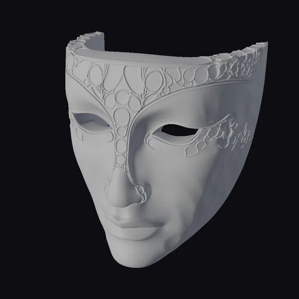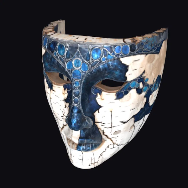 This stunning decorative mask features a predominantly white base with a cracked texture, giving it a weathered appearance. The blue ornate details are meticulously designed, with small circles and lines forming an intricate pattern across the forehead and around the eyes. The mask’s shape is reminiscent of a Venetian carnival mask, but with a unique stylized twist. The blue and white color scheme gives the mask a calming yet mysterious vibe, making it a perfect addition to any room. Whether you’re a fan of decorative art or just looking for a statement piece, this mask is sure to impress. Its high level of detail and realistic texture make it suitable for various applications, including 3D printing, animation, and virtual reality.
