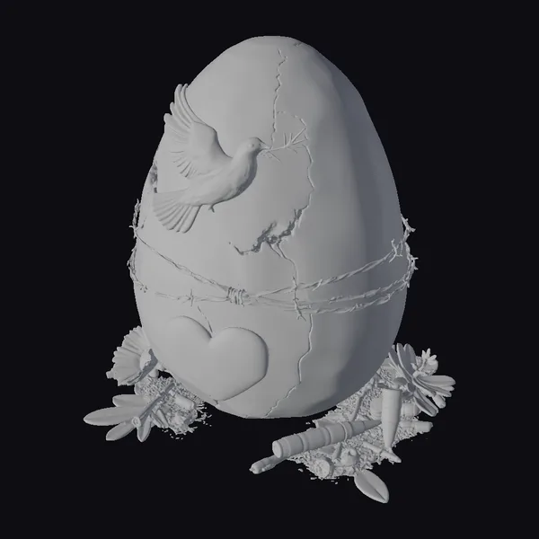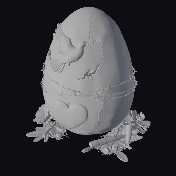 This intricately designed Easter egg model presents a poignant scene of peace and conflict. The egg, cracked and wrapped in barbed wire, features a stunning landscape with a dove in flight, holding an olive branch. The lower half showcases a heart-shaped emblem with a palette of colors, symbolizing diversity and unity. Surrounded by a scattering of bullets and a solitary yellow flower, the model speaks to the resilience of hope in the face of adversity. Crafted with meticulous attention to detail, it’s perfect for use in artistic projects, animations, or as a unique decorative piece. Its themes of peace, conflict, and renewal make it a compelling addition to any 3D model collection.