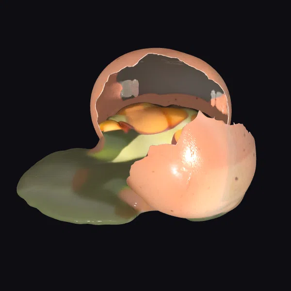 A meticulously crafted 3D model of a cracked egg, showcasing a delicate balance of textures and colors. The brown eggshell lies shattered, with jagged edges and a smooth, slightly glossy finish. The golden yolk, surrounded by a soft yellow membrane, peeks out from within. A vibrant green liquid, likely representing egg white, spills out from the cracked shell, adding a pop of color to the scene. The model’s intricate details, from the shell’s cracks to the yolk’s subtle sheen, make it an excellent choice for projects requiring realistic food visuals, such as animations, games, or architectural visualizations.