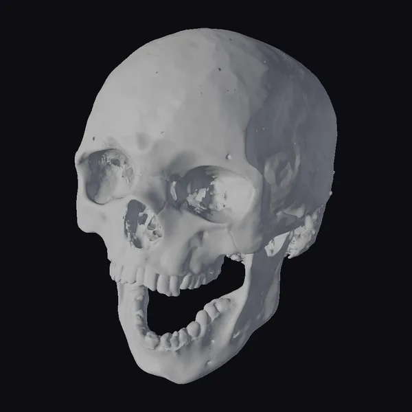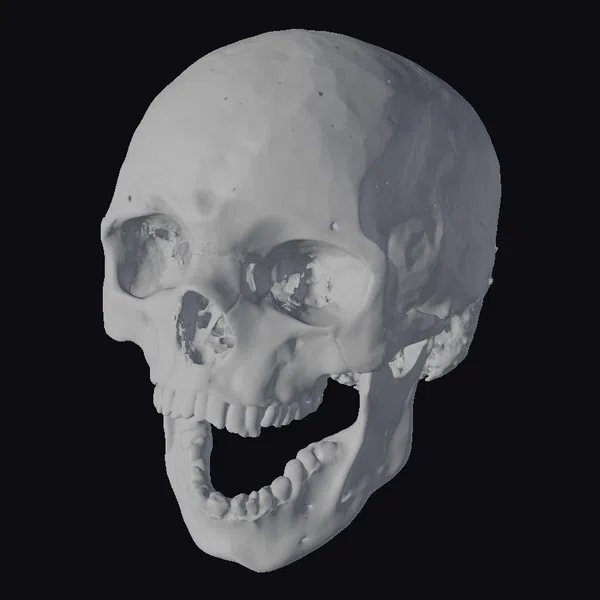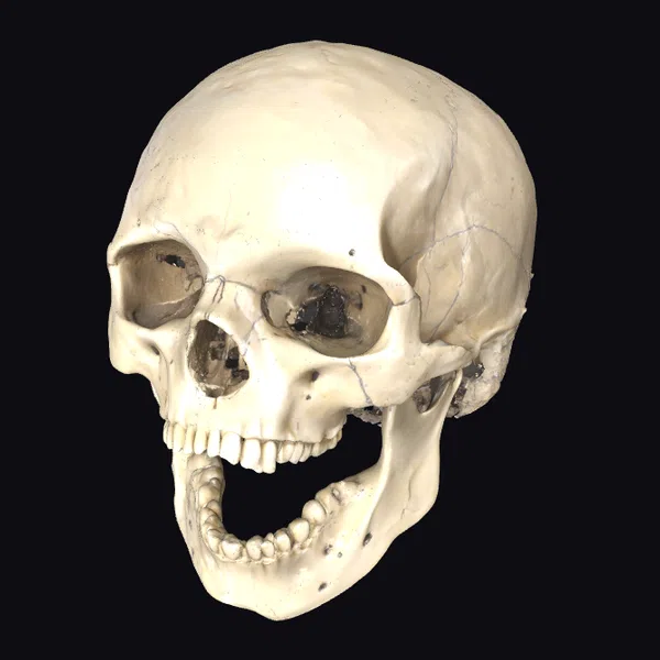 Positioned in a haunting, three-quarter view, this cracked human skull showcases an unparalleled level of detail, from the delicate curvature of the cranium to the intricate arrangement of teeth. The texture of the bone is finely rendered, with subtle cracks and fissures that add to the model’s realism. The empty eye sockets seem to stare into the distance, inviting the viewer into a realm of anatomical study or macabre artistry. This model is perfect for use in medical simulations, educational materials, artistic projects, or as a standalone piece in 3D printing, animation, or virtual reality applications.