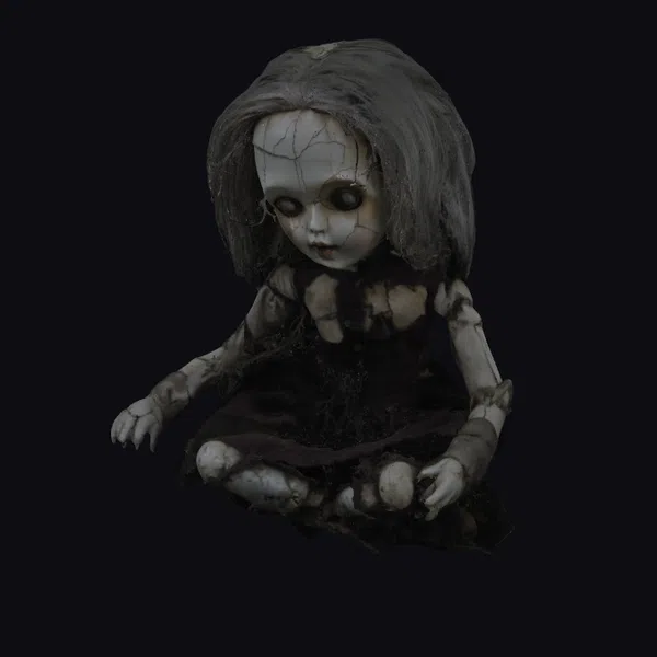 Perched on a haunting, almost skeletal frame, this cracked porcelain doll commands attention with her unsettling presence. Her face, a canvas of cracks, tells a story of forgotten beauty and tragic downfall. Dark eyes, sunk deep into their sockets, seem to hold a thousand untold stories, while her tattered black dress hangs loosely, as if barely clinging to her body. The doll’s pose, sitting with legs twisted and hands splayed out to the sides, evokes a sense of sudden, eerie movement. This model is perfect for those looking to add a touch of macabre elegance to their projects, whether it’s for game development, animation, or as a unique piece of digital art. Its detailed texture and realistic portrayal make it an excellent choice for creating immersive, horror-themed environments.