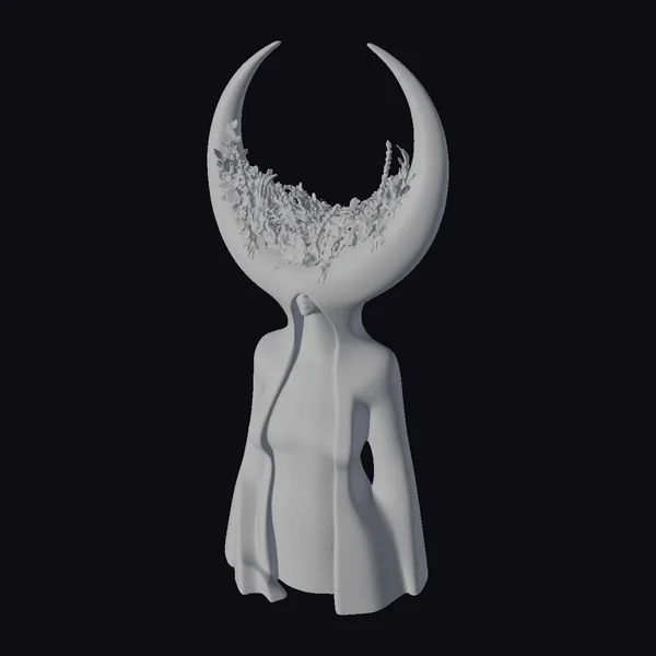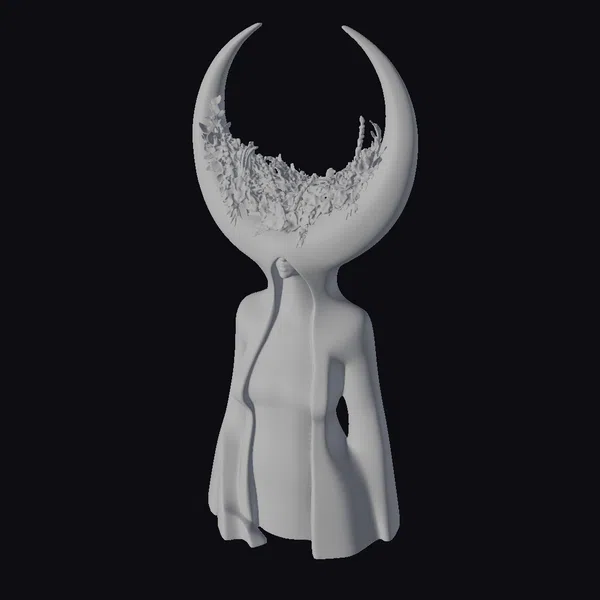 This stunning, surreal sculpture features a humanoid figure with a head shaped like a crescent moon, crowned with a lush, colorful floral wreath. The figure’s body is hollow, revealing a mesmerizing, swirling purple and black interior that glows with an ethereal light. The intricate details and textures of the model invite the viewer to explore its mystical world. Ideal for use in games, animation, VR/AR experiences, and design projects, this model is sure to captivate audiences with its unique blend of fantasy and wonder.