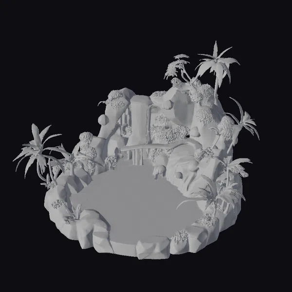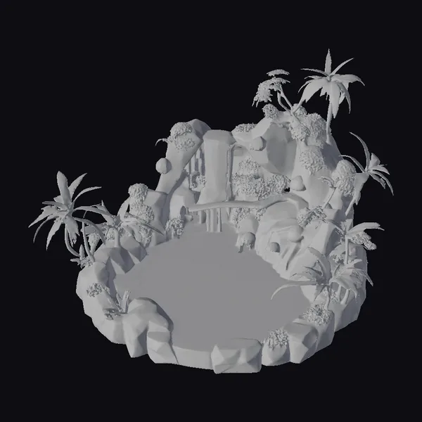 Gaze upon the breathtaking Crescent Moon Waterfall Diorama, where a gentle waterfall flows into a crystal-clear pool, set amidst a vibrant jungle landscape. The low-poly design masterfully balances simplicity with intricate details, from the delicate pink mushrooms to the lush greenery and palm trees. The opaline sky above adds a touch of magic, while the satin enamel finish brings a sense of depth and luminosity. This diorama is perfect for use in games, 3D printing, VR/AR experiences, animation, and design projects, offering a unique and captivating environment to inspire creativity.