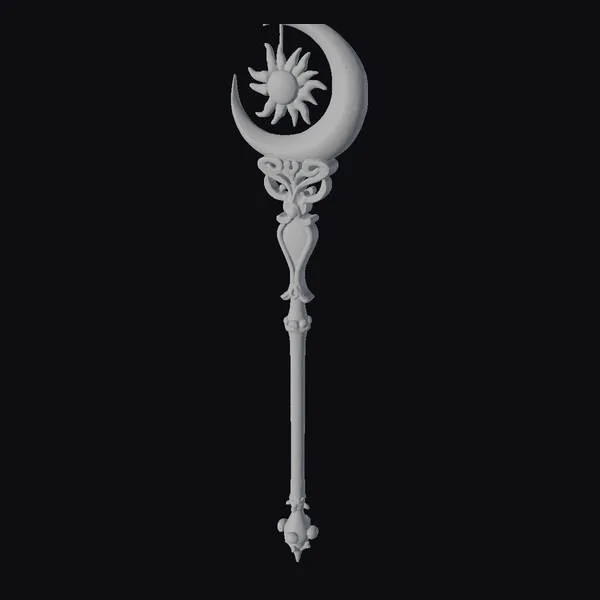 Intricately detailed, this scepter boasts a slender, ornate handle that tapers to a delicate point, adorned with a stylized heart-shaped motif near the top. The crescent moon, with its smooth, curved surface, cradles a bright yellow sun with dynamic, spiky rays. The contrast between the cool, metallic silver and the warm, golden sunlight creates a visually striking effect. Ideal for games, animation, or 3D printing, this model brings a touch of fantasy and mystique to any project.