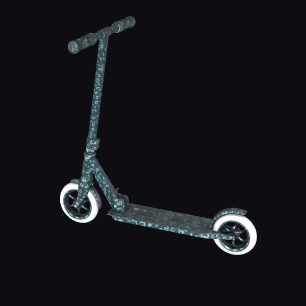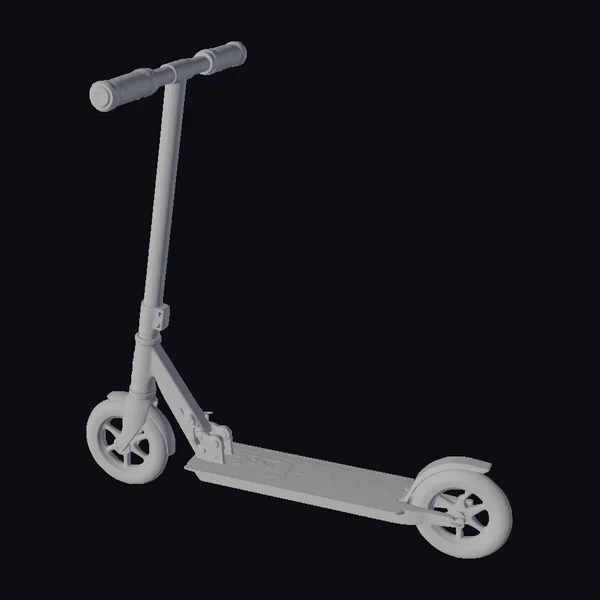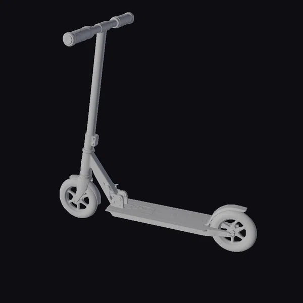 Detailed with precision, this scooter features a sturdy frame with a textured, metallic blue and gray finish that shimmers in the light. The handlebars are positioned for comfortable grip, while the wheels boast a sleek, modern design. The scooter’s pose conveys motion, as if it’s about to spring into action. Ideal for use in games, 3D environments, or animations where a modern, urban feel is desired. Its realistic proportions and details make it suitable for projects requiring a lifelike representation of a kick scooter.