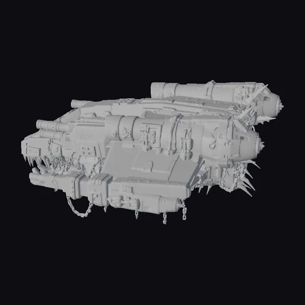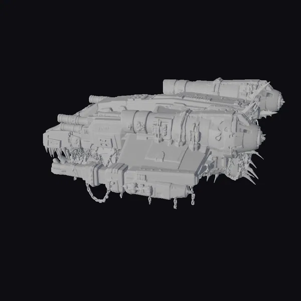 The Crimson Skull Dreadnought is a visually striking, heavily armored vehicle with a predominantly dark color scheme accented by crimson and gold. Its body is a complex assembly of metallic plates, tubes, and cannons, giving it a formidable, industrial appearance. The vehicle’s front features a distinctive skull design, complete with sharp teeth and glowing green eyes, adding to its intimidating presence. Equipped with multiple cannons and spiked armor plating, this dreadnought exudes a sense of power and aggression. Its detailed texture and lighting make it an ideal model for use in games, 3D printing, VR/AR experiences, animation, and design projects.