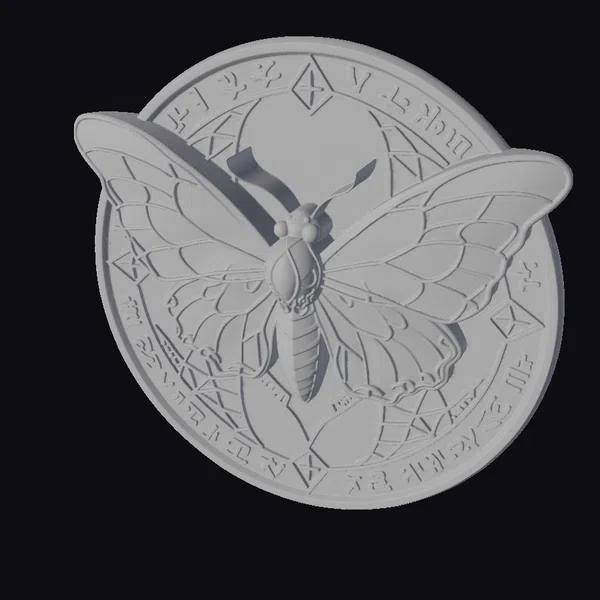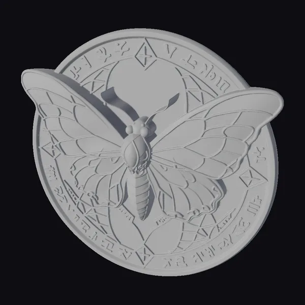 This exquisite stained glass moth is captured in mid-spread, its wings a kaleidoscope of red and black hues, meticulously outlined in gold. The moth’s body and antennae are positioned atop a circular gold plate adorned with etched symbols and markings that add to the mystique. The level of detail in the glasswork and the golden accents is exceptional, making this piece a standout. The combination of stained glass techniques with the golden filigree creates a visually striking effect. Ideal for use in games, 3D printing, VR/AR experiences, animation projects, or design work where a touch of elegance and mystery is desired.